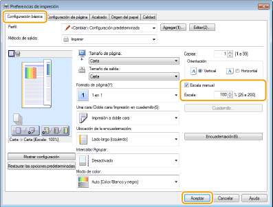 Las opciones de ampliación/reducción de algunas aplicaciones tienen prioridad con respecto a las del controlador de impresora.