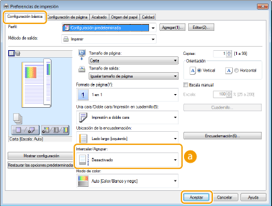 A la hora de imprimir copias de documentos de varias páginas, seleccione [Intercalar] para imprimir grupos completos según el orden de las páginas. Esta función resulta muy útil para preparar folletos para reuniones o presentaciones.