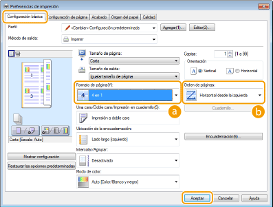 Puede imprimir varias páginas en una única hoja. Por ejemplo, puede imprimir cuatro o nueve páginas en una única hoja utilizando [4 en 1] o [9 en 1]. Utilice esta función si desea ahorrar papel o ver sus documentos en miniaturas.