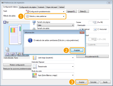 Seleccione [Edición y vista preliminar] en [Método de salida].