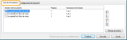 Haga clic en la pestaña [Lista de documentos] para mostrar los documentos añadidos en los pasos del 1 al 4. Puede quitar documentos seleccionándolos en la lista y haciendo clic en [Eliminar de la lista].
