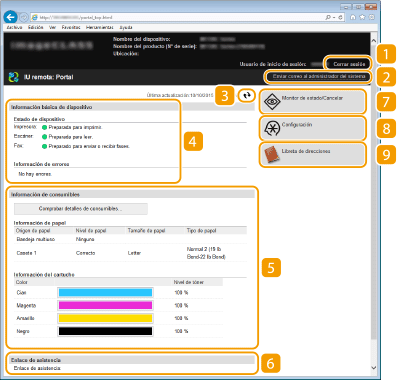 Muestra el enlace de asistencia especificado en [Información del dispositivo] debajo de [Gestión del sistema].