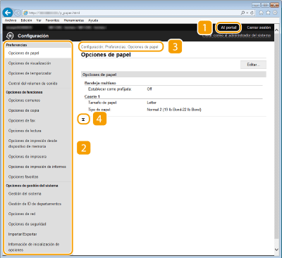 Muestra la página [Configuración]. Cuando haya iniciado sesión en el modo Administrador del Sistema, podrá cambiar los elementos de configuración y guardar/cargar los datos registrados.