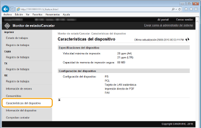 Se muestra información sobre el tamaño y el tipo de papel para el origen del papel, el número de modelo del cartucho de tóner, etc. También podrá hacer clic en [Comprobar detalles de consumibles] en la