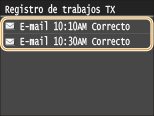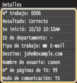 Cuando <Mostrar registro de trabajos> esté establecido en <Off>, no podrá comprobar los registros de los documentos enviados. Mostrar registro de trabajos