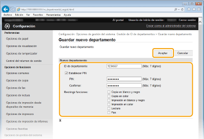 Introduzca un número de hasta siete dígitos para el PIN si está configurado para el ID de departamento.