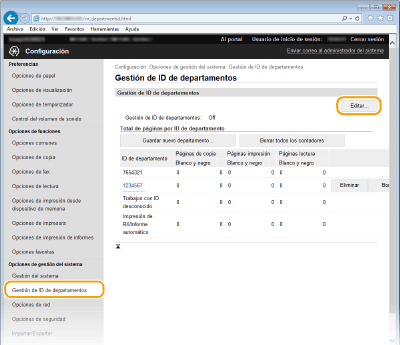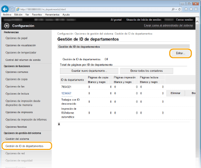 No modifique o elimine los ID de departamento. Las tarjetas de control que correspondan a los ID de departamento modificados o eliminados no podrán utilizarse.
