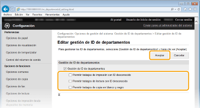 Seleccione la casilla de verificación [Utilizar Administración de ID de departamento] y haga clic en [Configuración] a la derecha.