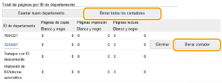 Si desea que el número vuelva a ser cero, haga clic en el vínculo de texto correspondiente situado debajo de [ID de departamento] y haga clic en [Borrar contador]