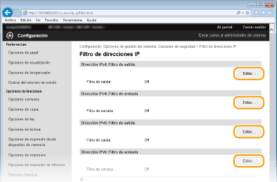 Si las direcciones IP se introducen de forma incorrecta, es posible que no pueda acceder al equipo desde la IU remota, en cuyo caso deberá establecer <Filtro de direcciones IPv4> o <Filtro de direcciones IPv6> en <Off>. Filtro de direcciones IPv4 Filtro de direcciones IPv6
