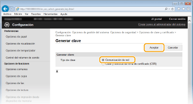Seleccione [Clave y solicitud de firma de certificado (CSR)] y haga clic en [Aceptar].