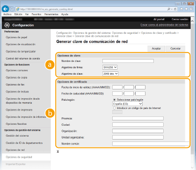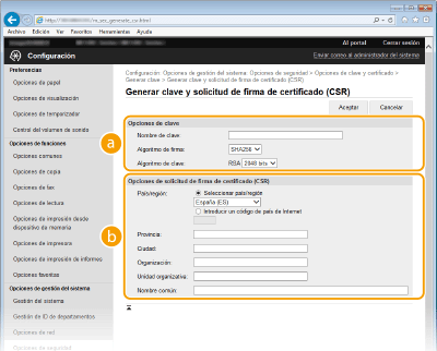 Los pares de claves pueden generarse con el equipo en caso necesario para la comunicación cifrada a través de la Capa de sockets seguros (Secure Sockets Layer, SSL). Podrá utilizar SSL para acceder al equipo a través de la IU remota. Podrán generarse hasta cuatro pares de claves para el equipo. Los certificados autofirmados se utilizan con pares de claves generados en la "Comunicación de red". Con una "Solicitud de clave y firma de certificado (Key and Certificate Signing Request, CSR)", podrá solicitar un certificado digital emitido por la autoridad de certificación (CA) para el par de claves generado por el equipo.