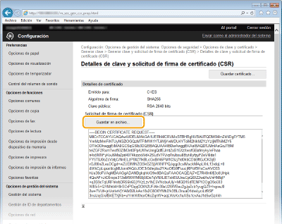 El archivo de Solicitud de clave y firma de certificado (Key and Certificate Signing Request, CSR) se almacenará en el equipo.