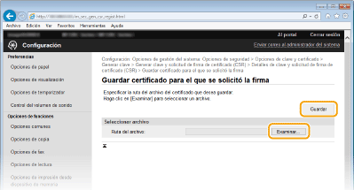 Haga clic en [Examinar], especifique el archivo para la solicitud de firma del certificado y haga clic en [Guardar].
