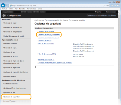 Haga clic en [Opciones de seguridad] [Opciones de clave y certificado].