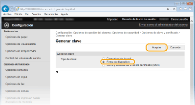 Haga clic en [Actualizar] a la derecha de Clave de firma del dispositivo.