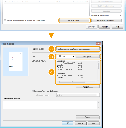 Vous pouvez joindre une page de garde au document que vous envoyez. Sélectionnez une page de garde parmi les trois modèles de pages de garde disponibles dans le pilote de fax ou créez la vôtre. Pour plus d'informations, cliquez sur [Aide] dans l'écran du pilote de fax.