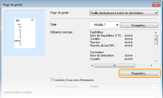 Affiche les éléments à inclure dans une page de garde. Pour les modifier, cliquez sur [Paramètres].