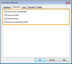 Sélectionnez les éléments relatifs au destinataire que vous voulez inclure et renseignez les informations. Le nom des destinataires, des entreprises, des services et les numéros de fax indiqués dans l'onglet [Sélectionner la destination]/[Saisir la destination] (