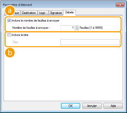 Cochez cette case si vous désirez indiquer, sur la page de garde, le nombre de feuilles que vous êtes sur le point d'envoyer et précisez-en le nombre dans [Nombre de feuilles à envoyer]. Le nombre de feuilles à envoyer n'est pas comptabilisé automatiquement. La valeur que vous indiquez dans ce champ est reportée dans la page de garde.