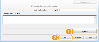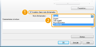 Les notes d'information telles que "Urgent" et "Confidentiel" sont disponibles. Vous êtes également libre de taper directement des caractères dans [Note d'information] au lieu de sélectionner une note dans la liste.