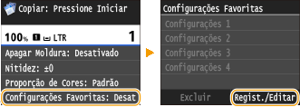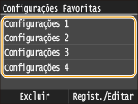 Se quiser excluir uma configuração registrada, toque em <Copiar>  <Configurações Favoritas>  <Excluir>  Selecione as configurações  <Sim>  <Sim>.