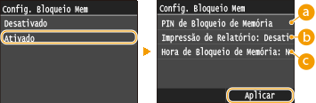 Para armazenar documentos na memória, defina <Config. Bloqueio Mem> para <Ativado>. Você também pode especificar configurações opcionais, tais como uma configuração de segurança que torna necessária uma senha para desbloquear o recurso e uma configuração de tempo que especifica um período de tempo durante o dia no qual os documentos recebidos serão armazenados na memória.