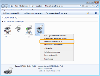 Clique com o botão direito no ícone do driver de fax de sua máquina e clique em [Preferências de impressão].