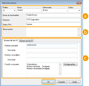 Insira o(s) número(s) de fax. Hifens podem ser inseridos entre os números conforme o necessário. Se você deseja adicionar explicações sobre o uso dos números de fax, como "Casa" ou "Escritório", insira-as em [Descrição].