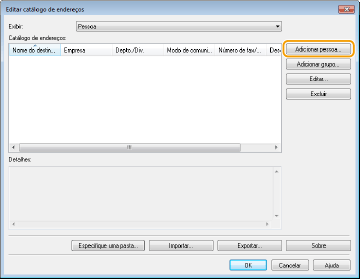Para alterar ou excluir destinos registrados, selecione um destino a partir de [Catálogo de endereços] e clique em [Editar] ou [Excluir].