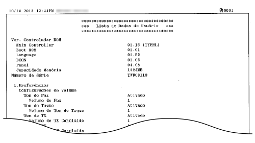 A Lista de Dados do Usuário não inclui as listas de configurações das <Configurações de Rede>, <Config. Gerenciamento Sistema> ou uma parte das <Configurações de Fax>. Para verificar todas as configurações, inclusive <Configurações de Rede>, <Config. Gerenciamento Sistema> e todas as <Configurações de Fax>, imprima a <Lista de Dados de Gerente do Sistema>.