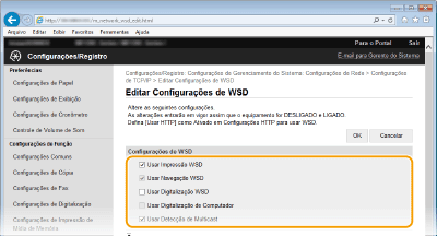Marque a caixa de seleção para imprimir por WSD. Quando você não estiver usando a impressão WSD, desmarque a caixa de seleção. [Usar Navegação WSD]
