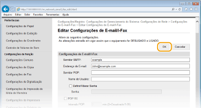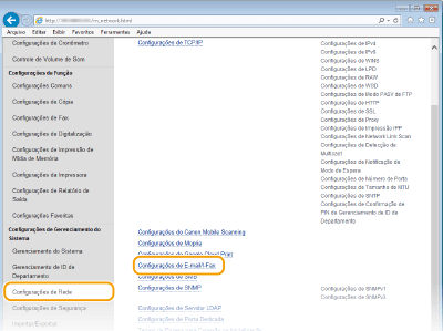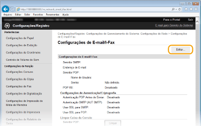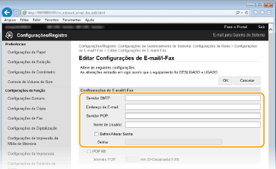Antes de enviar e-mails ou I-Faxes, use a IU remota para configurar as configurações detalhadas de envio e recebimento, como as configurações para uso da máquina para envio e recebimento de I-Faxes e as configurações de autenticação e criptografia POP. Entre em contato com seu provedor ou administrador de rede para obter as configurações necessárias.