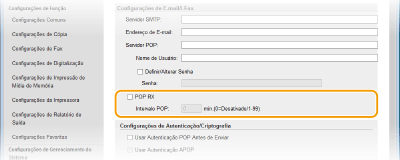 Esta configuração define o intervalo (em minutos) usado para conectar-se automaticamente ao servidor POP3. Se houver documentos de I-Fax no servidor, eles serão automaticamente recebidos e impressos.