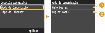 toque em <Meio Duplex> ou <Duplex Total>.![]() <Meio Duplex>Envia e recebe dados de comunicação de forma alternativa. Selecione-a quando a máquina estiver conectada a um dispositivo de rede usando half duplex.