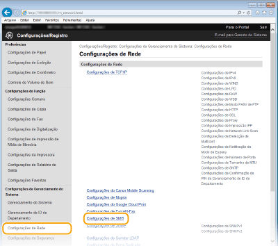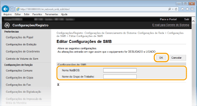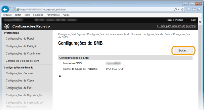 O Server Message Block (SMB) é um protocolo para compartilhar recursos, como arquivos e impressoras, com mais do que um dispositivo em uma rede. A máquina usa o SMB para armazenar documentos digitalizados em uma pasta compartilhada. Dependendo da sua rede, você pode ter de definir o nome NetBIOS e o nome do grupo de trabalho.