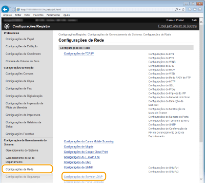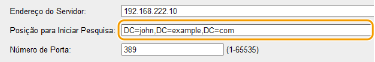 Se um servidor LDAP estiver implementado na rede, você poderá pesquisar números de fax e endereços de e-mail no servidor e depois especificá-los como destinatários ou registrá-los no Catálogo de endereços. Observe também que, se a autenticação da função de envio ( Autenticação do servidor LDAP ) estiver ativada, será preciso registrar o servidor usado para autenticação. Você pode registrar no máximo cinco servidores LDAP para pesquisa e autenticação na máquina. Registre os servidores LDAP através da IU remota.
