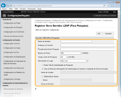 Clique em [Registrar Novo Servidor] para [Servidor LDAP (Para Pesquisa)] ou [Servidor LDAP (Para Autenticação)].