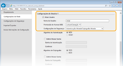 Para definir ou alterar a senha, marque a caixa de seleção e digite entre 6 e 16 caracteres alfanuméricos para a senha na caixa de texto [Senha de Autenticação] ou [Senha de Criptografia]. Para confirmar, digite a mesma senha na caixa de texto [Confirmar]. As senhas podem ser definidas independentemente para os algoritmos de autenticação e criptografia.