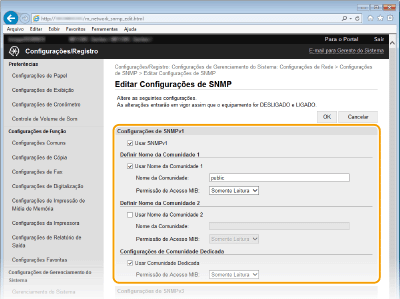 Se ambas as versões do SNMP forem ativadas, recomenda-se que a permissão do acesso ao MIB no SNMPv1 seja definida para [Somente Leitura]. A permissão de acesso ao MIB pode ser definida independentemente no SNMPv1 e no SNMPv3 (e para cada usuário no SNMPv3). Selecionar [Leitura/Gravação] (permissão de acesso total) no SNMPv1 nega os recursos robustos de segurança que caracterizam o SNMPv3 dado que a maioria das definições da máquina podem ser controladas com o SNMPv1.