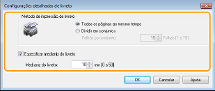[Dividir em conjuntos]: Imprime como vários pacotes divididos pelo número de páginas especificadas em [Folhas por conjunto]. Dobre cada pacote e depois combine-os como um livreto. Selecione esta opção quando o documento possuir tantas páginas que você não consiga dobrá-lo como um único livreto.