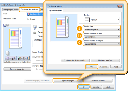 Selecione a posição de impressão da data de impressão, nome de usuário ou número de página
