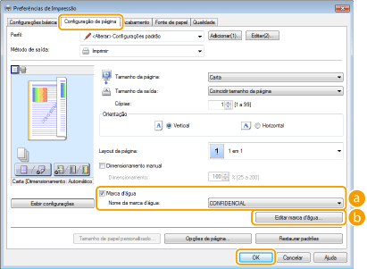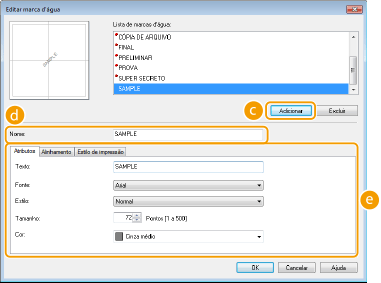 Clique em cada guia para especificar o texto, a cor, ou a posição de impressão da marca d'água. Para mais informações, clique em [Ajuda] na tela do driver de impressora.