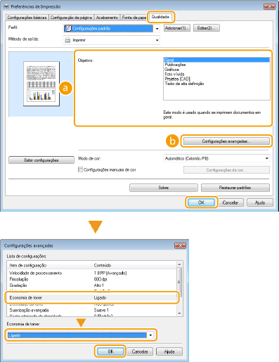 Na tela [Configurações avançadas], você pode especificar várias configurações de impressão diferentes das configurações de economia de toner. Para mais informações, clique em [Ajuda] na tela do driver de impressora.