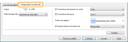 Clique na guia [Configurações de impressão] para exibir a tela de especificação das configurações de impressão, como o número de cópias, ou impressão dos dois lados/de um lado. As configurações especificadas aqui são aplicadas a todo o trabalho de impressão.