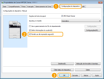 Clique na guia [Configurações do dispositivo] e certifique-se que a caixa de seleção [Permitir uso de impressão segura] está selecionada.