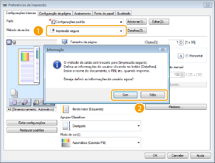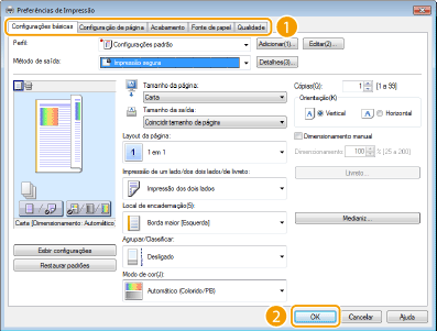 Clique nas guias [Configurações básicas], [Configuração de página], [Acabamento] [Fonte de papel] ou [Qualidade] para especificar as configurações de impressão em cada tela conforme o necessário.