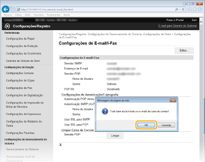 Quando você clica em [OK] na janela de mensagens, todos os e-mails que estão na caixa de mensagens do servidor são excluídos. Se a máquina não tiver uma conta de e-mail especial, primeiro é preciso verificar se algum e-mail que está na caixa de mensagens precisará ser mantido.