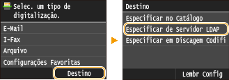 Se seu escritório possui um servidor LDAP instalado, você pode usar os destinatários registrados no servidor. Para especificar destinatários, acesse um servidor LDAP através da máquina e então pesquise um destinatário.