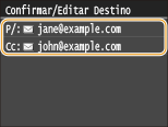 Antes de selecionar <Confirm./Edit.> na etapa 1, você pode tocar em  /  para alternar os destinos que você especificou. Exiba um destino que você deseja excluir e pressione  .